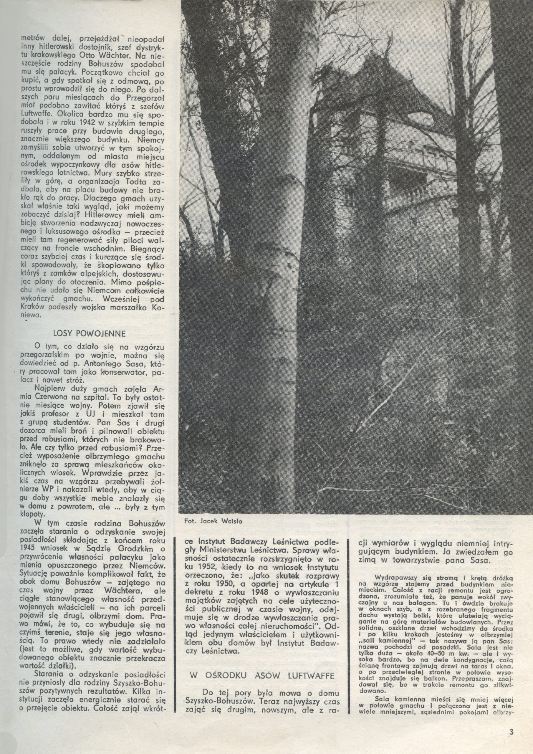 Szyszko-Bohusz Adolf, Ludwik, urodzony 1 września 1883 w Narwie (Rosja, dziś Estonia) zmarł 1 października 1948 w Krakowie. Syn Polikarpa Szyszko-Bohusza, inż. technologa i Marceliny z Rząśnickich, inż. architektki; dr architekt, konserwator architektury i jej historyk oraz dydaktyk – profesor w uczelniach architektonicznych, ochotnik 6 pułku Legionów (1915-1916), reklamowany z wojska do odbudowy Wawelu. Po szkole wstępnej w Narwie i gimnazjum klasycznym w Tallinie (1894-1895) oraz ukończeniu, z odznaczeniem, gimnazjum klasycznego w Petersburgu (1895-1902), studiował m.in. pod kierunkiem prof. Leona N. Benoit, specjalisty od architektury zabytkowej, na Wydziale Architektury Akademii Sztuk Pięknych w Petersburgu, który ukończył, wykonując pod kierunkiem prof. Leona N. Benoit projekt dyplomowy pt. Kurhaus w stylu rokoko, również z odznaczeniem (1902-1909), otrzymując złoty medal oraz nagrodę pieniężną w wysokości 2 000 rubli, umożliwiającą mu poznanie w następnych latach architektury Austrii, Czech i Moraw (1909-1910). Notatki z tych lat, swoiste zapisy i szkice architektoniczne zapoczątkowały jego podobne działania w odniesieniu do architektury Polski, podzielonej wówczas między 3 zaborców, które podjął w porozumieniu z Komisją Historii Sztuki Akademii Nauk w Krakowie. Już od roku 1902 współpracuje z Zygmuntem Glogerem, wykonując mu pomiary i rysunki zabytkowych obiektów drewnianych. Od roku 1905 współpracuje też z M. Sokołowskim w Komisji do Badań Historii Sztuki w Polsce Akademii Umiejętności w Krakowie, zostając w roku 1908 jej członkiem, a w roku 1910 sekretarzem. W roku zorganizowano w Krakowie wystawę rysunków z jego podróży studialnych. Ponieważ był to swoisty fundament późniejszej całej jego działalności, to przytoczyć tu trzeba jej ówczesną informację zamieszczoną w Krakowie w czasopiśmie „Architekt” (styczeń 1/1911).