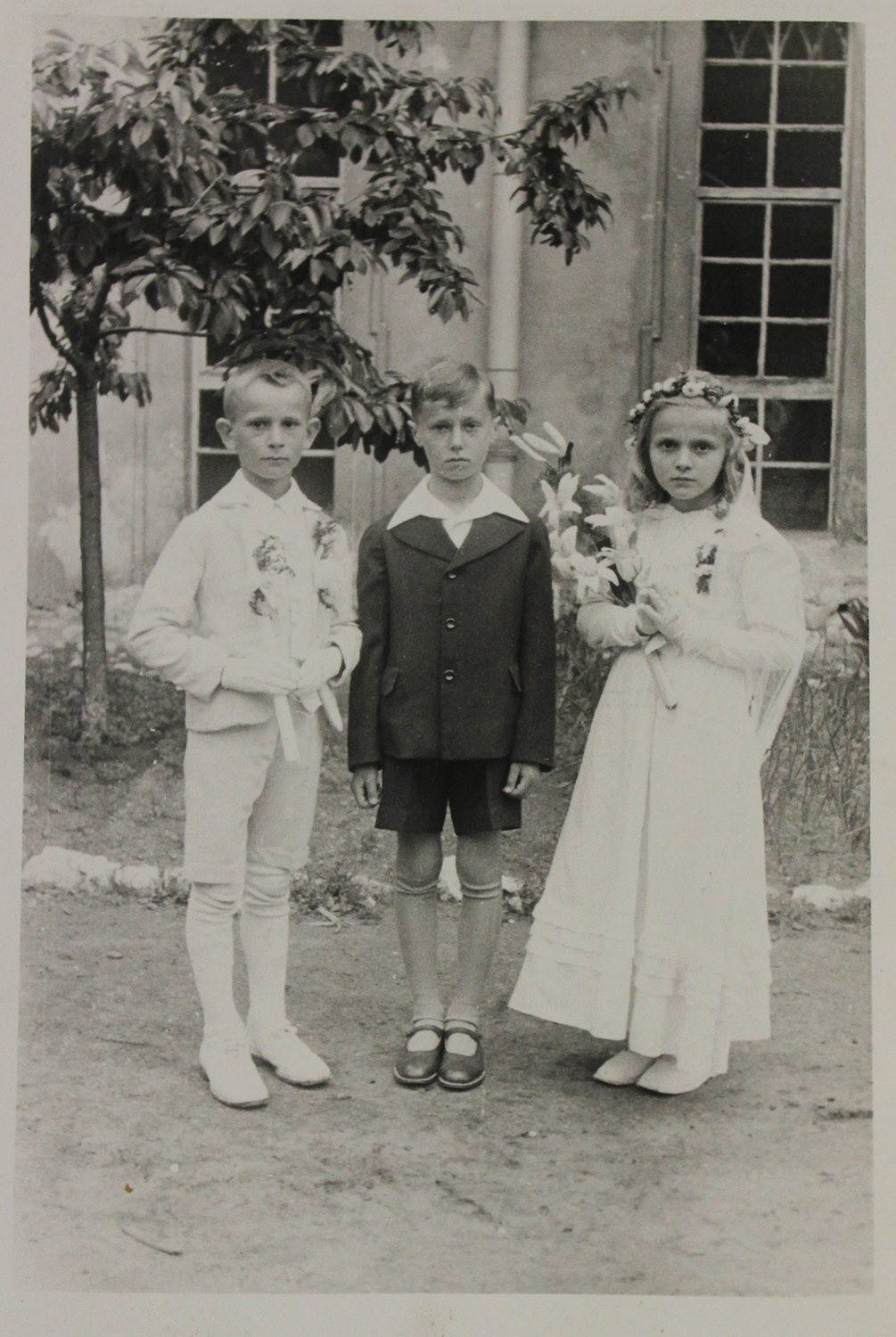 I Komunia Święta 03 IV 1944 r., Ludwik Spiss junior (pośrodku) w towarzystwie Cesi (nazwisko nieznane) i Walerowskiego (imię nieznane)